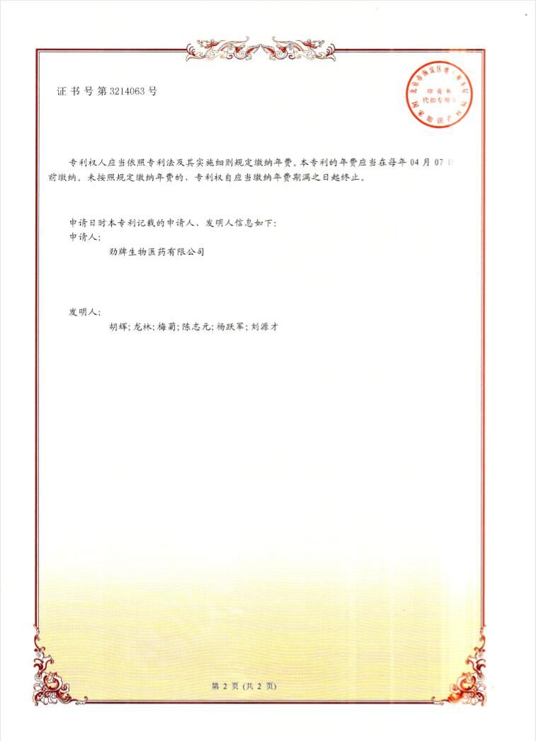 1月11日,由胡輝、龍林、梅菊、陳志元、楊躍軍、劉源才6人提出的《一種具有輔助降血糖功效的低分子量青稞β-葡聚糖的制備方法》獲得發(fā)明專利。該專利為勁牌公司2019年自然年度獲批的第一項發(fā)明專利。
